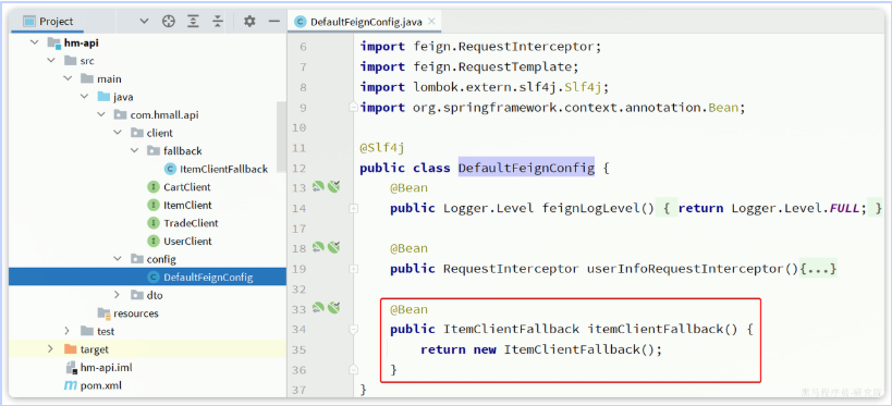 步骤二:在hm-api模块中的com.hmall.api.config.DefaultFeignConfig类中将ItemClientFallback注册为一个Bean